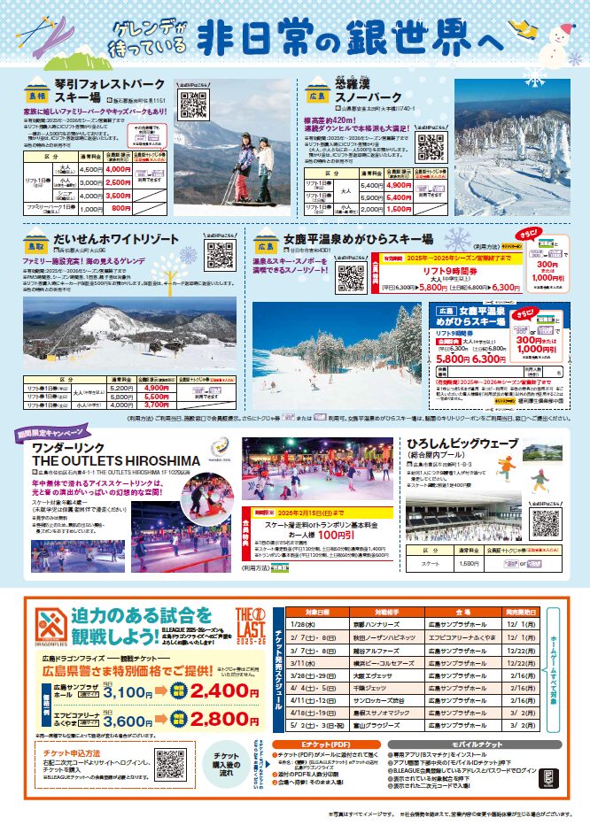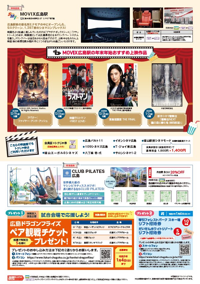 2026.01.20R7年12月号会報誌【目次】<表紙>ホテルレストラン特集 <中面(左)>新・忘年会特集 <中面(右)>ウィンタースポーツ/ドラゴンフライズ<裏面>MOVIX広島駅/プレゼント企画 ほか<表紙>ホテルレストラン特集<中面(左)>新・忘年会特集 <中面(右)>ウィンタースポーツ/ドラゴンフライズ<裏面>MOVIX広島駅/プレゼント企画 ほか✨🎁プレゼントの応募はこちらから🎁✨①ドラゴンフライズ ペア観戦チケット ⇒応募はこちらから②スキー場の招待券 ⇒応募はこちらから